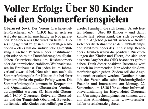 Oberursel (ow). Der Verein Orscheler-helfen-Orschelern e.V (OHO) hat es sich zur Aufgabe gemacht, unschuldig in Not geratenen Menschen aus Oberursel zu helfen. Dieses Engagement zeigt sich in vielfältigen Aktionen – ob es um die individuelle Unterstützung einzelner Personen oder Institutionen geht oder ob es die Durchführung des alljährlichen Ostereiersuchens im Rushmoorpark oder das inzwischen etablierte Weihnachtsessen im Brauhaus ist. Für jeden ist im Jahresverlauf etwas dabei. Neu sind nun auch die Sommerferienspiele für Kinder, die bei ihrer Premiere direkt ein großer Erfolg waren. Die Sommerferienspiele konnten in Kooperation und Organisation mit Oberurseler Vereinen durchgeführt werden: SC Eintracht Oberursel, 1 FC 04 Oberursel, Reitverein Oberstedten und der Tennisclub Oberursel. Bewerben durften sich alle Kinder aus bedürftigen Oberurseler Familien, die sich keinen Urlaub leisten können. Über 80 Kinder – und damit konnte fast jedem Kind, das sich beworben hat, ein Angebot gemacht werden – freuten sich über die Teilnahme an den Fußballcamps, der Ponyfreizeit oder des Tenniscamp. Besonders erfreulich waren die positiven Rückmeldungen der Kinder und Eltern, die sich über das neue Angebot des OHO besonders gefreut haben. Dank dieser positiven Resonanz wird es auch im kommenden Jahr wieder die Sommerferienspiele geben. Zudem soll das Angebot noch erweitert werden. Darüber hinaus lädt der Verein alle seine Fördermitglieder, Freunde und Interessierte am Montag, 22. September, um 18.30 Uhr zu einer Informationsveranstaltung im Elaya Hotel Oberursel ein. Um entsprechend planen zu können, wird um eine Anmeldung unter www.orschelerhelfen-orschelern.de gebeten.